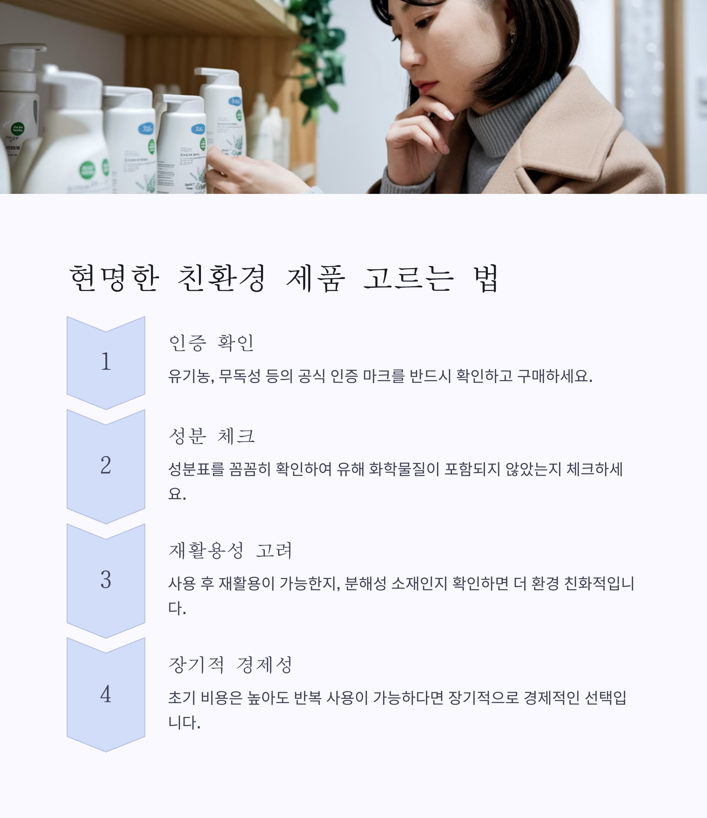 무독성 인증 여부, 성분표 확인, 재활용 가능 여부가 중요합니다. 제품에 유기농 인증, BPA-Free, 무향료 등의 표시가 있는지 꼭 확인하세요. 또한, 자연 분해가 가능한 제품을 선택하는 것이 좋습니다.