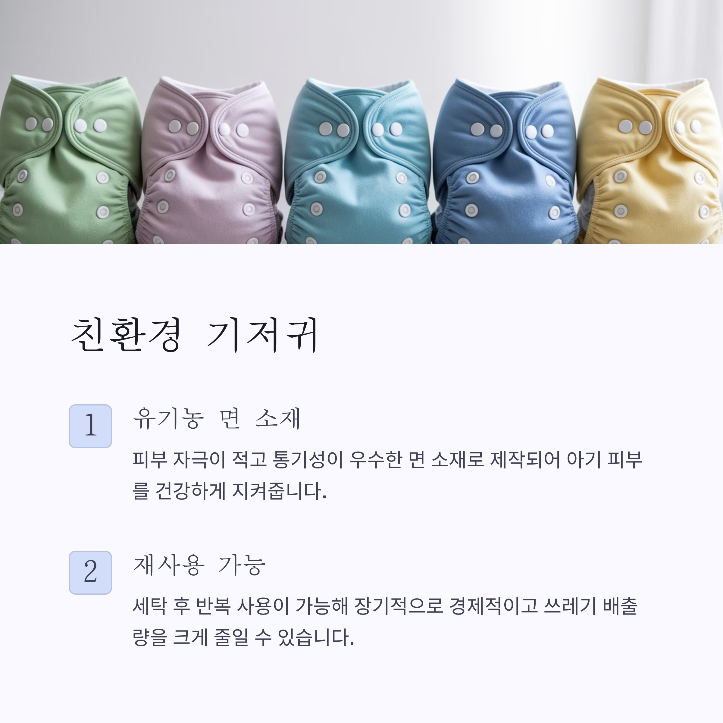 | 유기농 면 기저귀 | 피부 자극 감소, 재사용 가능 | 그로비아, 대나무베베 |