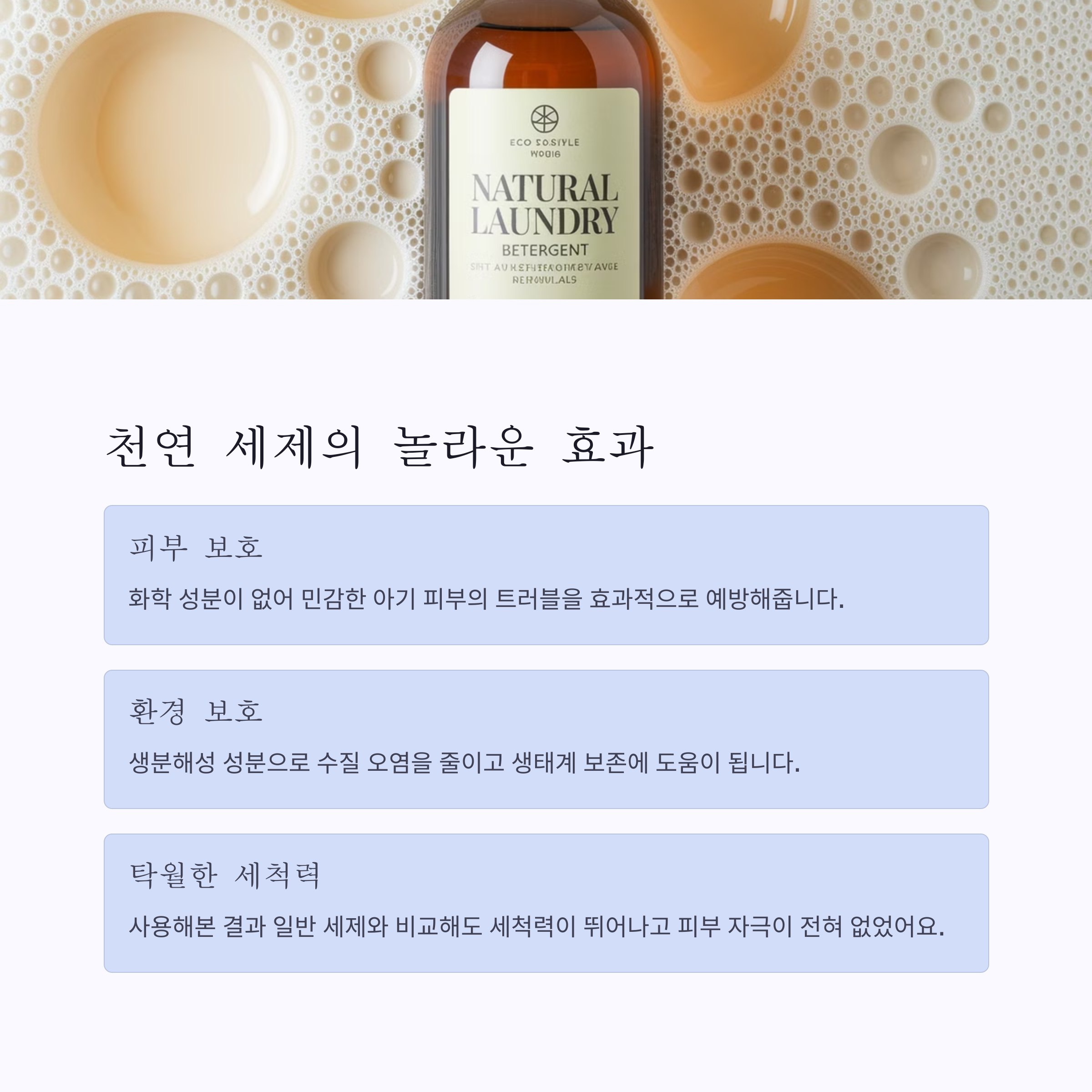 저는 개인적으로 친환경 세제를 적극 추천합니다. 아기 옷을 세탁할 때 화학 성분이 남지 않도록 베이킹소다 기반 세제를 사용하고 있으며, 피부 트러블이 줄어들고 냄새도 훨씬 상쾌합니다.