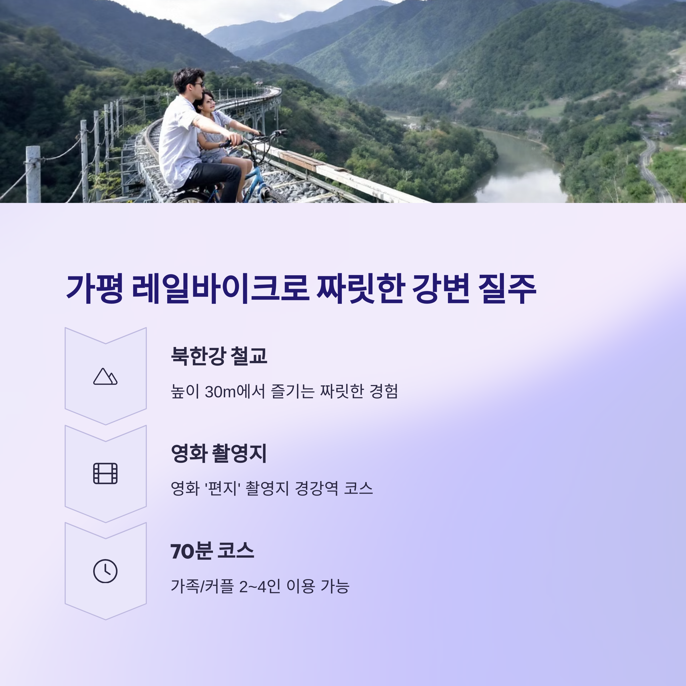 근처에는 가평 레일바이크 체험장이 있어, 북한강변을 따라 철길 위를 달리는 색다른 체험이 가능합니다. 아이들과 함께하는 가족 여행은 물론, 연인들에게도 특별한 하루를 선사해주는 코스입니다.