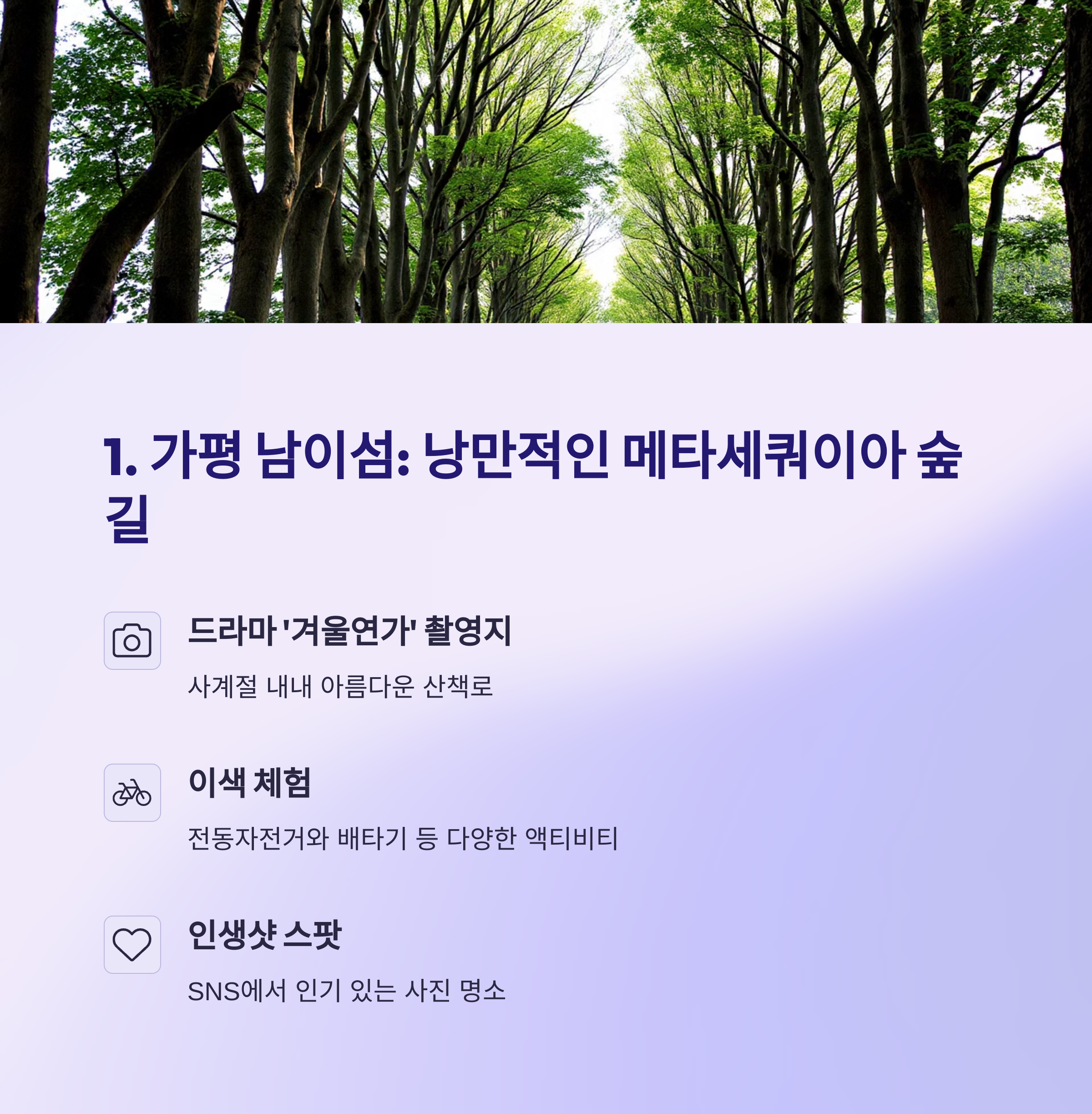 가평은 사계절 내내 사랑받는 대표적인 당일치기 여행지입니다. 남이섬은 메타세쿼이아 숲길과 유럽풍 정원이 어우러진 풍경으로 유명하며, 걷기만 해도 힐링이 되는 코스입니다.