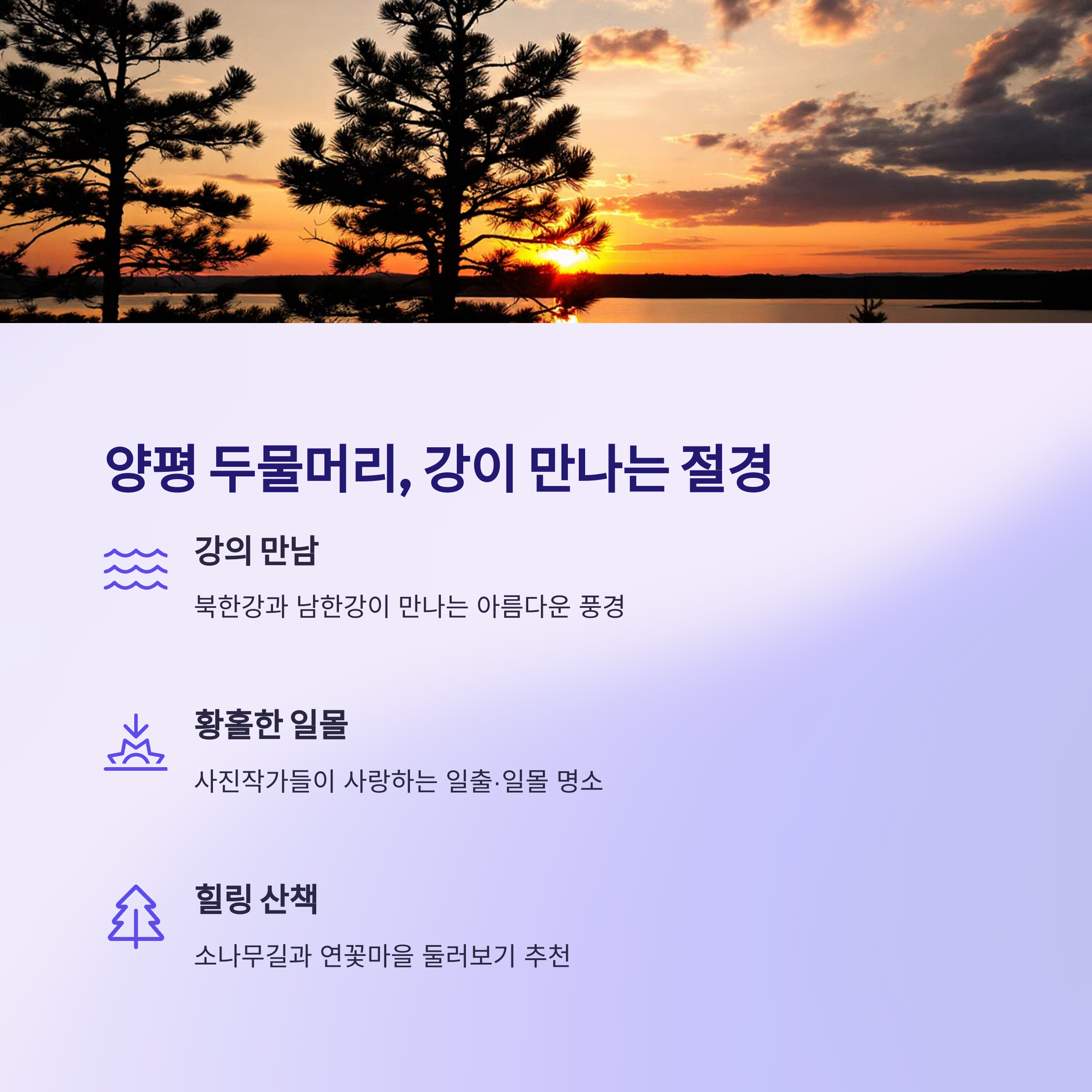 양평 두물머리는 북한강과 남한강이 합류하는 지점으로, 물안개가 피어오르는 이른 아침 풍경이나 석양이 지는 늦은 오후가 특히 아름답습니다. 수양버들과 강변이 어우러져 사진 명소로도 유명하며, 잔잔한 풍경 덕분에 사색과 여유를 즐기기에 딱 좋습니다. 자전거 대여가 가능해 강변을 따라 라이딩을 즐기기에도 좋으며, 주변에는 로컬푸드를 즐길 수 있는 식당과 카페도 다양하게 있습니다.